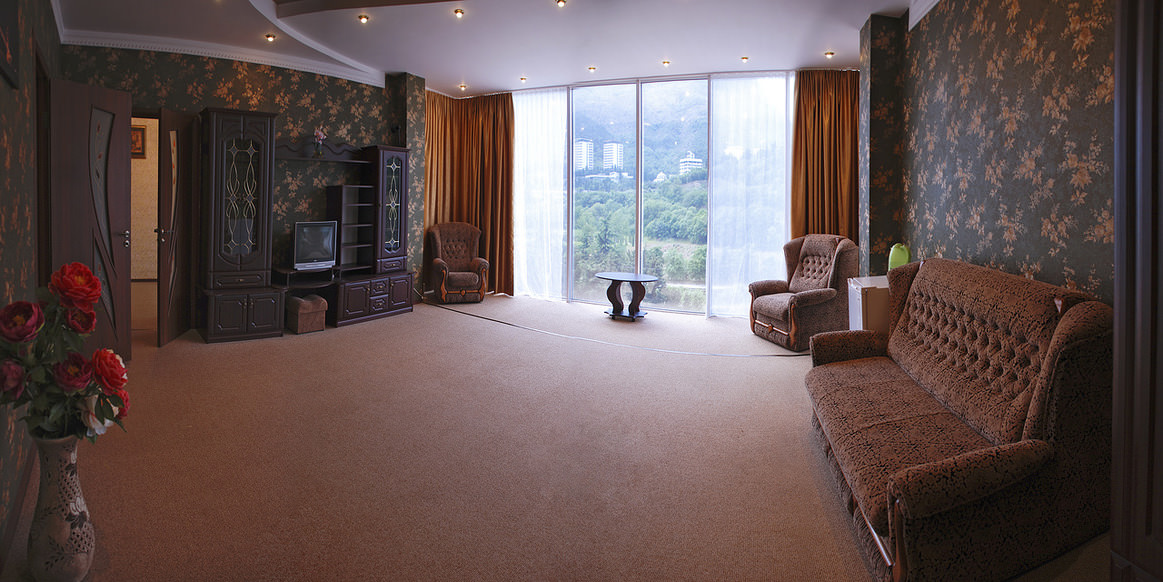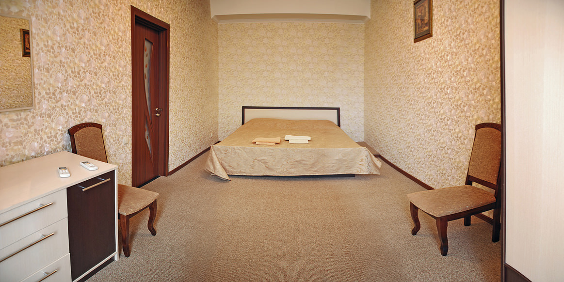 Площадь номера - 55 кв.м. 3 осн. места. 2 доп. места. Кухня. Мебель: вешалка, диван раскладной, зеркало, комод, кресло, кресло-кровать, кровать двуспальная, прикроватные тумбочки, столик журнальный, тумба под телевизор, шкаф, шкаф для посуды. Оборудование: кондиционер, микроволновая печь, сплит-система, стиральная машина, телевизор ЖК, холодильник, чайный набор посуды, электрочайник. Санузел: с ванной, туалетные принадлежности. Сервис: Wi-Fi бесплатно, смена полотенец (1 раз в 3 дня), смена постельного белья (1 раз в 5 дней), уборка номера (ежедневно).